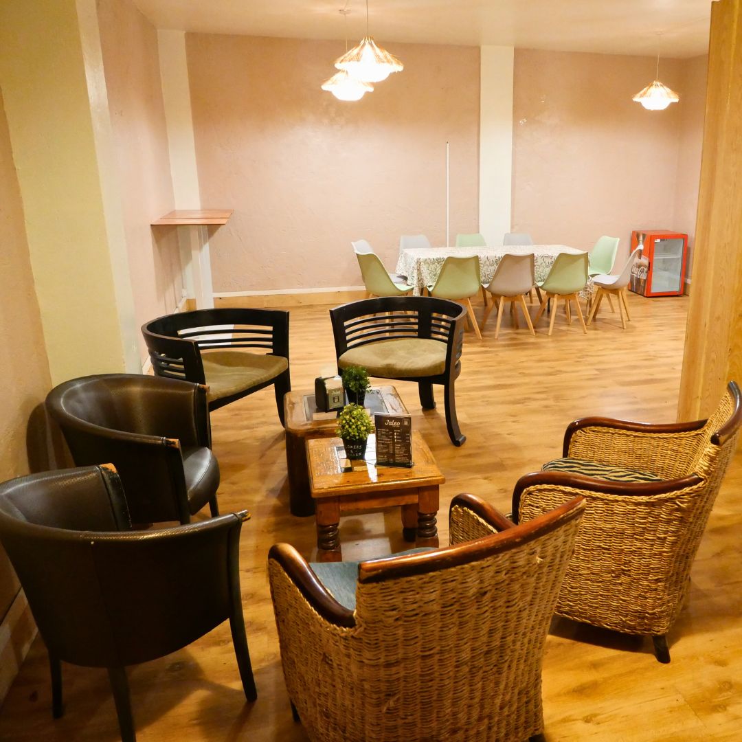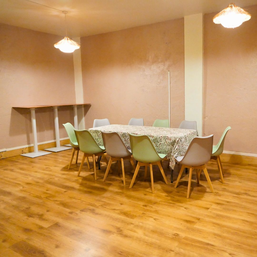 Ponemos a tu disposición un espacio amplio y versátil, equipado con mesas y sillas para acoger cómodamente a tu grupo.